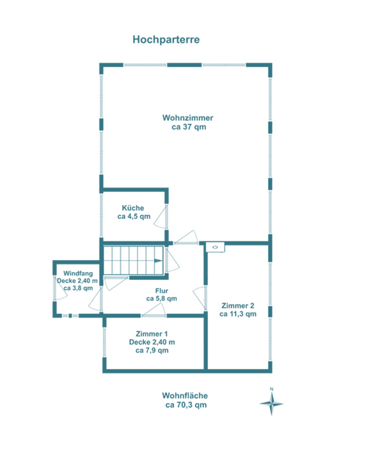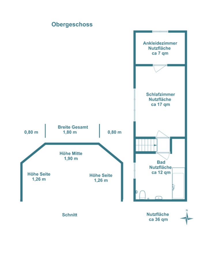 Der Eingang zum Wohnhaus erfolgt über einige Stufen, die in einen vorgelagerten kleinen Windfang führt. Von dort aus gelangt man über einen Flur in den Wohnbereich. Dieser besteht aus einem sehr großen Wohnzimmer, 2 zusätzlichen Räumen und einer möglichen Küche. Das bereits ausgebaute Dachgeschoss erreicht man über eine Treppe. Dort befinden sich das Schlafzimmer mit einem Ankleideraum und das dazugehörige Badezimmer. Die obere Etage hat eine Stehhöhe von ca. 1,90 m, dadurch ergibt sich eine Nutzfläche von ca. 36 m².